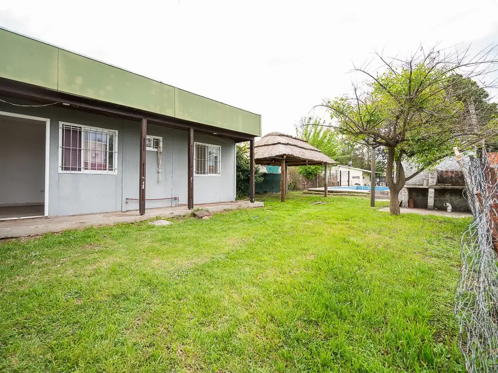 En el exterior, se destaca una pileta en perfecto estado, ideal para disfrutar en temporada estival, y un quincho con techo de paja, que genera un espacio acogedor para reuniones familiares y sociales.