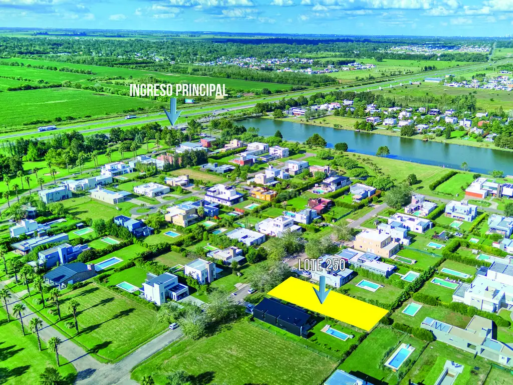 Lote en barrio cerrado Puerto Roldan de 900 m2 aproximadamente, parquízado, cercano al ingreso pero lejos de los ruidos de la autopista y a 2 cuadras del lago.