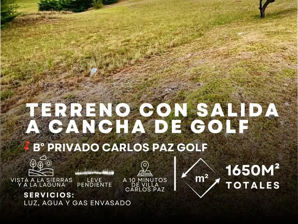 En esta oportunidad te traemos un lote premium con salida a la cancha de golf, espectacular vista a las sierras y laguna, de 1650 m2 totales con la combinación perfecta de servicios y paisajes naturales. El lote está ubicado estrategicamente a solo 10' del centro de Villa Carlos Paz, 30' de Córdoba Capital y 90' de Mina Clavero con importante plusvalía gracias a su localización.