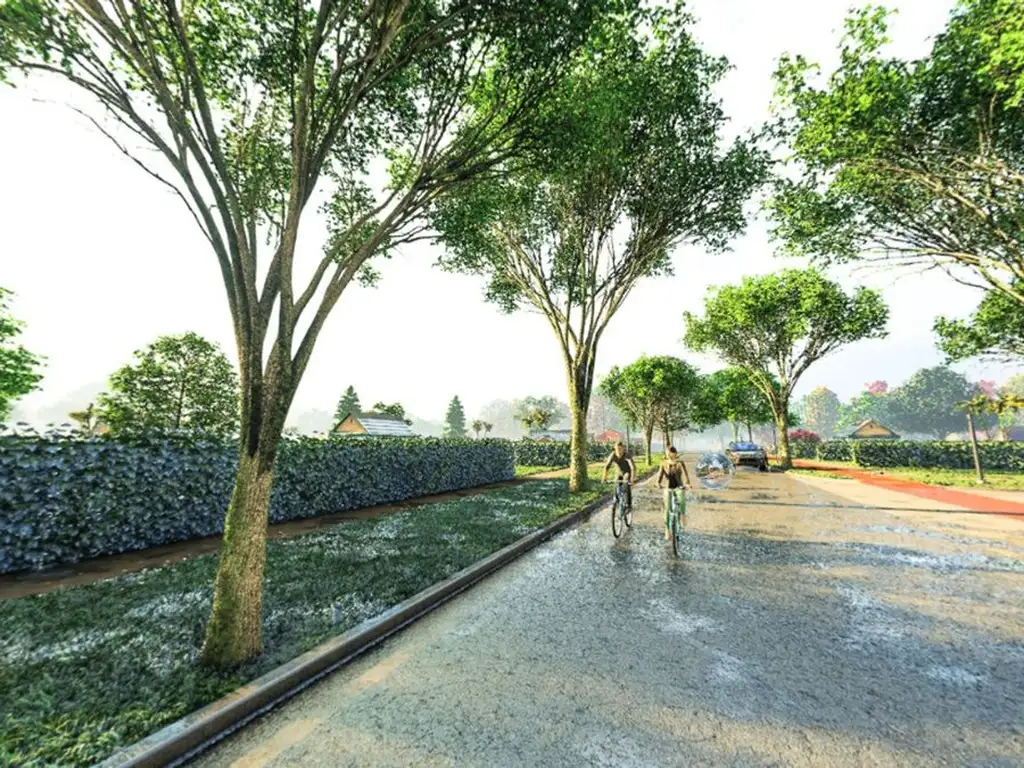 El barrio ofrece espacios verdes, plazas, bicisendas y forestación, además de control de acceso y alarma comunitaria.