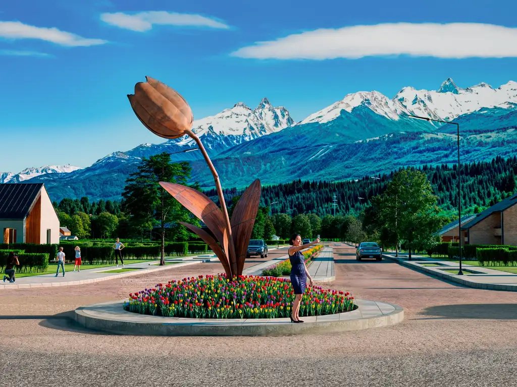 Una de las características distintivas de este desarrollo es su ingreso principal, donde se destaca una escultura representativa de la flor de Tulipán, símbolo emblemático de Trevelin. Esta pieza artística no solo resalta la identidad local, sino que también refleja el compromiso del proyecto con el embellecimiento de su entorno, ya que el propietario del famoso campo de tulipanes participará activamente en esta tarea, asegurando que el barrio se mantenga visualmente atractivo.